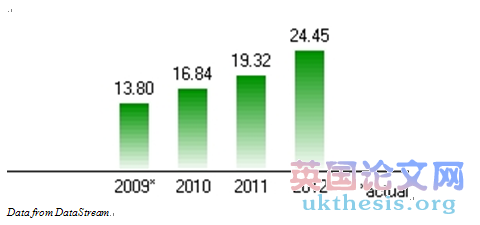 From the chart, the highest EPS is in 2012 which suppose to reach at 24.45%, and it will grow up every year. And compare the peer companies, the EPS performance of Savills is overwhelmed than others. It shows that although in the economy bottom, Savills still have strong capacity to create profits in the next future.