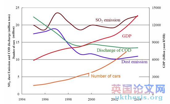 At earlier phases of economic growth in China, the application of coal-fired and low-efficiency boilers, etc., resulted in high densities of particulate matter and sulfur dioxide in the air. It shows the development of GDP, energy use and the average sulfur dioxide concentrations over the past 20 years in Figure 2.