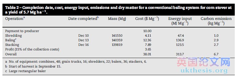 biomass and bioenergy 34 (2010) 75–81 Table 2 Completion date, cost, energy input, emissions and dry matter for a conventional baling system for corn stover at a yield of 5.7 Mg haL1 . Operationa Date completedb Mass (Mg) Cost ($ Mg 1) Energy input (MJ Mg 1) Carbon emission (kg Mg 1) Payment to producer Shredding Balingc Stacking Profit (15% of the collection costs) Overall Dec 10 Dec 13 Dec 16 141550 140359 139819 10.00 4.11 12.36 7.89 3.65 38.01 47.4 136.9 123.5 313.7 1.0 2.9 2.7 6.7 aNo.ofequipment:combines,48;graintrucks,16;shredders,22;balers,36;stackers,6.bStartofharvestisSeptember15.cLargerectangularbalerstover can be easily compacted into pellets for easy transport and storage [21,22]. Economics and energy input to the pelleting operation were obtained from Mani et al. [23].
