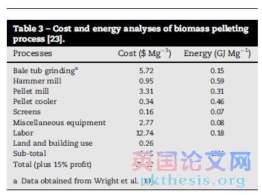 Table 3 shows the breakdown of cost and energy demand for the biomass pelleting process. The pelleting plant has a production capacity of 6Mg h 1 with annual production of 45 Gg [23]. Roughly three pellet mills are needed to process the entire biomass for the ethanol plant. The pellet plant operates 24 h for 310 days annually (annual utilization period 85%). The dry biomass is used as a feedstock for the pellet plant and that eliminates the drying operation. Total cost of pelleting was about 30.19 $ Mg 1 of pellets with an energy requirement of 1.84 GJ Mg 1. About 11% of the biomass energy is used to produce pellets. Cost of pelleting biomass can be further reduced if a larger capacity pellet plant (12–15 Mg h 1) is considered [23]. #p#分頁標題#e#
