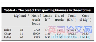 Table 4 The cost of transporting biomass in three forms. Mg load 1 No. of Loads No. of Total Cost truck h 1 trucks ($ h 1) ($Mg 1) loads Bales 18 9722 1.16 3.24 249.54 9.98 Chop 11 15909 1.89 5.30 408.33 16.33 Pellet 40 4375 0.52 1.46 112.29 4.49