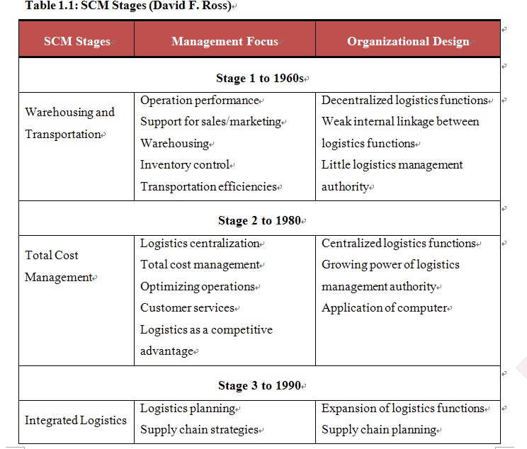 The SCM concept could be said to consist of five distinct management stages. The first can be described as the era of internal logistics departmentalism. In the second stage, logistics began the migration from organizational decentralization to centralization of core functions driven by new attitudes associated with cost optimization and customer service. Stage three witnessed the dramatic expansion of logistics beyond a narrow concern with internal warehousing and transportation to embrace new concepts calling for the linkage of internal operations with analogous functions performed by channel trading partners. As the concept of channel relationships grew, the old logistics concept gave way, in stage-four, to full supply chain management. Today, with the application of internet technology to the SCM concept, we can describe SCM as entering into stage five, e-SCM. These stages are portrayed in Table
