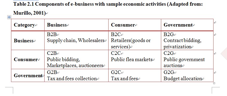 The above table illustrates the broad segments of e-business. This paper focuses on the B2C segment and excludes other segments, which is defined as the use of a variety of Internet applications that enable companies to sell goods and services directly to the end-customer on the Internet.