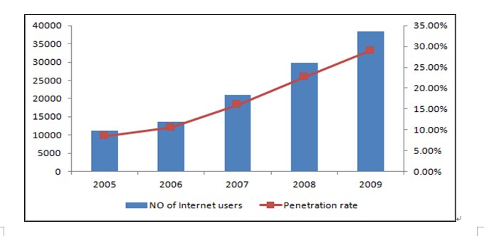 According to CNNIC (China Internet Network Information Center), by December 31, 2009, the number of Chinese Internet users and the Penetration rate of the Internet had reached 384 million and 29% respectively. The number of Internet users increased by 40 million compared with late 2008, up 28.9%, and the increase in the number of Chinese Internet users remains robust. #p#分頁標題#e#