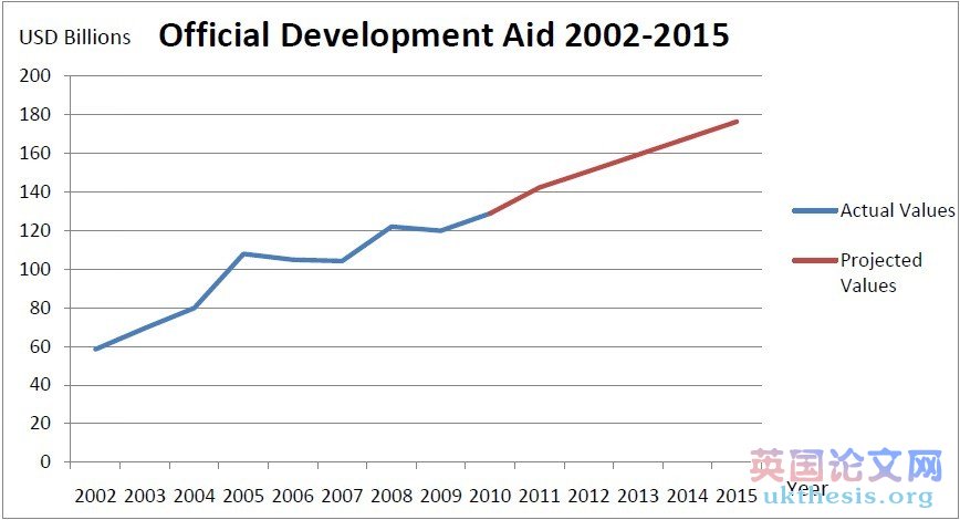 From Figure A, we can ascertain that the as of 2005, the finance required to meet the Millennium Development Goals was on track according to the World Bank’s 2002 estimations. If the current trend continues, by 2015 the expected ODA will be $176.3 billion. [Projection estimated using linear regression and trend analysis]
