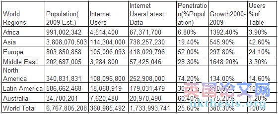 上表顯示的是全球互聯(lián)網(wǎng)用戶和世界各地的人口,根據(jù)上面的表中,互聯(lián)網(wǎng)用戶數(shù)量隨著人口增加越來越高。亞洲地區(qū)互聯(lián)網(wǎng)用戶在八個世界地區(qū)中比例增長最快。