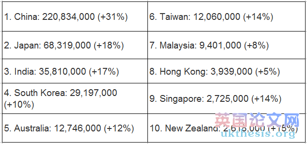 在過去的一年中,亞太地區(qū)的互聯(lián)網(wǎng)用戶已經(jīng)呈現(xiàn)絕對增長的態(tài)勢,擴大了近22%,網(wǎng)站游客近十億,大多數(shù)個別國家在該互聯(lián)網(wǎng)領域經(jīng)歷兩位數(shù)的增長率。