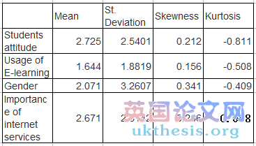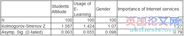 For the table below, we also tested the normality by using one sample Kolmogorov -Smirov test. To show that the variables are normally distributed, the significance level must more than 0.05. Based on the result given, the significance level for student attitude, which is 0.063 that greater than 0.05, significance level for usage of E-Learning is 0.055 that greater than 0.05, significance level for gender is 0.098 and importance of internet services is 0.079. Thus, all the variables are normally distributed.