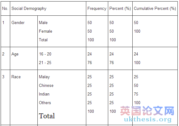 Out of 100 questionnaires distributed, the entire questionnaires enable to collect back and do the future analysis. The sample is divided equally between 50 male and 50 female as shown in Table 1: Demography in List of Table in this report.#p#分頁標題#e#