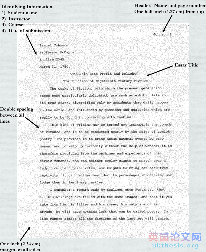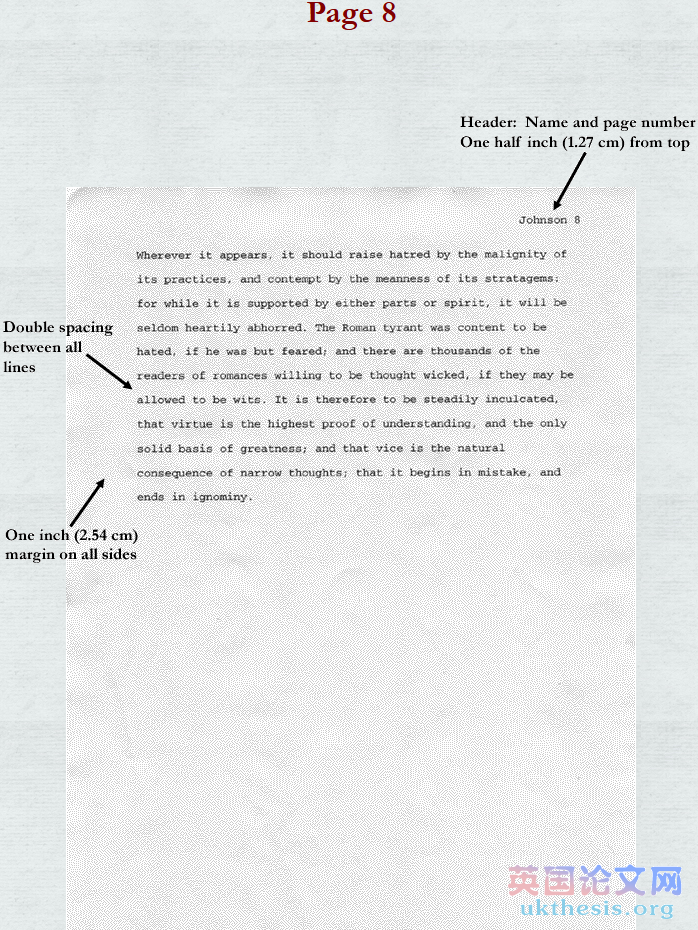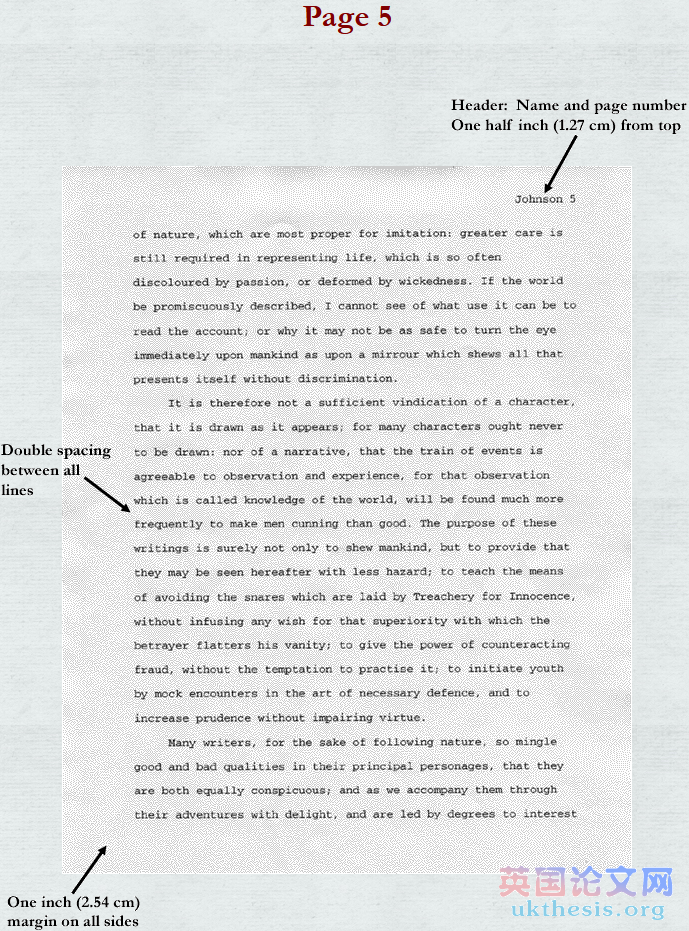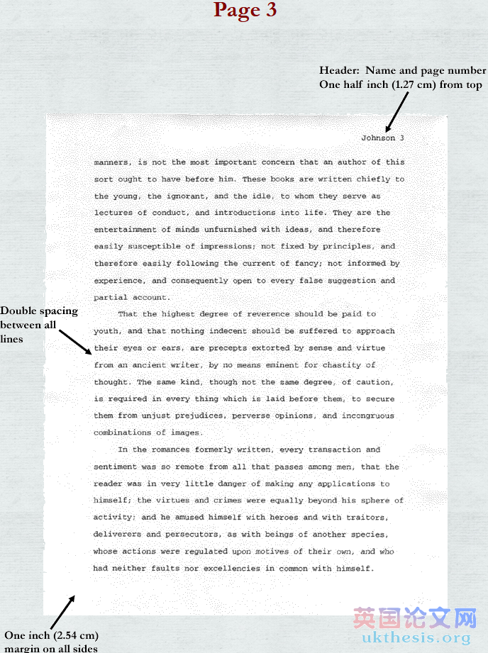 研究dissertation不應(yīng)該是包括獨(dú)立的標(biāo)題,而是需插入一個(gè)包括你的姓和頁數(shù)的“頭”,它與右對(duì)齊,離頁面頂部有1/2英寸(1.25cm)的距離。還有左對(duì)齊且每個(gè)行之間是雙倍行距,離頂部大約1.25cm(即距離為1英寸(2.54cm))的前提項(xiàng)目,如以下類型: