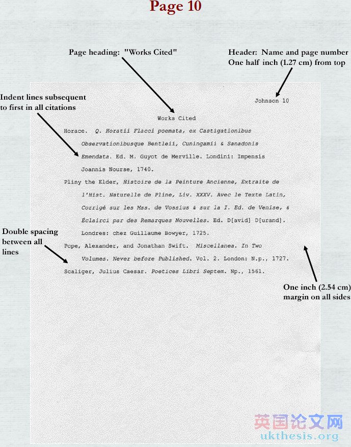 在參考過的作品清單中也要有包括你的姓和頁數(shù)的“頭”,寫在也是離頁面頂部有1/2英寸(1.25cm)處,且這些連續(xù)編號(hào)同樣會(huì)出現(xiàn)在同一系列的其他dissertation中。也是距離頁面頂部1英寸(2.54cm)處寫第一個(gè)書名目錄.
