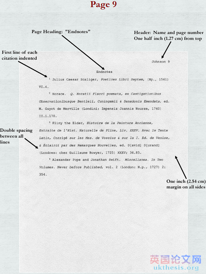 在每頁的尾注中同樣有包括你的姓和頁數(shù)的“頭”、它也是離頁面頂部有1/2英寸(1.25cm)處,在同一系列的其他dissertation中也要與連續(xù)編號(hào)。同樣是距離頁面頂部1英寸(2.54cm)處開始寫第一個(gè)尾注。