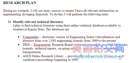下面這個示例中,該作者的研究計劃分為了四部分:查找相關文獻,獲得文獻的方式,網上搜索相關內容,向專家或其他人員咨詢。