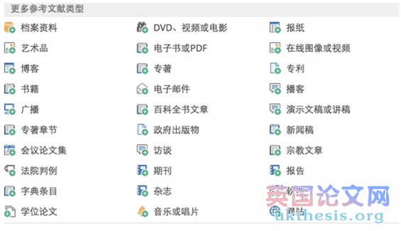 在這個網(wǎng)站,你可以通過選擇文獻類型,來生成bibliography。最常見的包括書籍、期刊dissertation、報紙和網(wǎng)站。