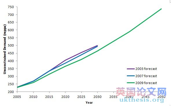 在2003年的DFT白皮書“航空運輸的未來”,估計對航空旅行的需求,假定沒有限制潛在的機場擴建或發展,是每年400-600萬人次(MPPA)不受約束。 (2)在2007年的DFT的“英國航空乘客的需求和CO2預測”,不受約束的需求在2030年重新估計495mppa在中級情況。 (5)2009年1月新報告的同名估計不受約束的中等水平,2030年需求超過假定為平均7%,低于2003(4)預測,未來20年的增長模式,是465mppa。