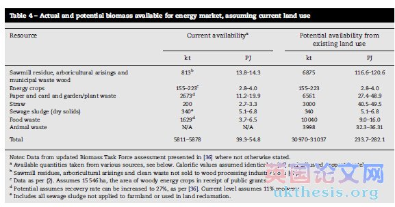 Table 4 gives an illustration of the potential contribution of domestic biomass resources to this demand. ‘‘Potential’’ in this case refers to the maximum amount of biomass that could be made available to energy markets, given the current land-use pattern in the UK and the demands from other sectors (resources that would be recycled or used by the wood processing industry are excluded). The table shows that full mobilisation of all currently available biomass could supply around half of the projected biomass demand and that these resources are underexploited at present. However, the assessment in Table 4 does not take account of the marginal cost of exploiting large proportions of the identified biomass resources or the ability of these resources to compete in energy markets with imported biomass or other energy sources. #p#分頁標題#e#
