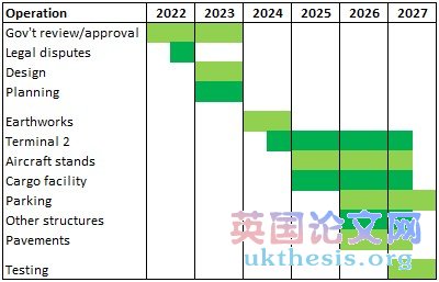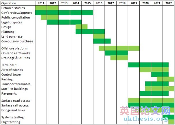 估計建設的時間表已根據(jù)審查其他主要機場建設項目,最特別的是關西,仁川,赤鱲角機場和最近的希思羅機場5號航站樓建設。