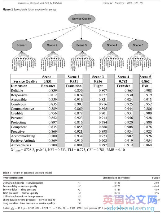 Figure 2 displays the second-order factor structure for the 65service quality items (13 dimensions £ five stages). Given thelarge sample size and number of latent variables in the model,we employ the normed ?t index (NFI), Tucker-Lewis index(TLI) and comparative ?t index (CFI) to assess ?t. Our study isnot immune to the multicollinearity measurement problemsexperienced by other service quality researchers. Althoughcorrelations between error terms exist within scenes (as well asbetween scenes), the model ?t (x22;010¼ 8;728:2, p , 0:01,NFI ¼ 0:733, TLI ¼ 0:773, CFI ¼ 0:781, RMR ¼ 0:10)indicates that the data approximates ?ve different scenes asexpected. Fit can be improved, of course, by allowing errorterms within each scene to be correlated (e.g. reliability andresponsiveness are highly correlated). Exploratory factoranalysis produces similar results (i.e. ?ve clear factors) withlimited second-order cross-loadings. In contrast, modeling the65 service quality items as 13 factors with ?ve items each (i.e.?ve reliability items from each scene, ?ve responsiveness items,and so on) produces signi?cantly (x28¼ 6;577:8, p , 0:01)worse ?t to the data (x22;002¼ 15; 305:9; CFI ¼ 0:57). Hence,the second-order factor structure appropriately models themulti-scene service encounter as anticipated.Interestingly, measurement of scale reliabilities across eachof the ?ve scenes for like items (e.g. all ?ve responsivenessitems from each of the scenes) indicates high reliability(Cronbach’safor all such scales exceed 0.86). Thus,passengers do view a speci?c service quality dimension (e.g.proactive service) as related across the scenes, but the resultsfrom both exploratory and structural equation modelingdemonstrates that each dimension is more strongly related tothe other service quality dimensions within a particular scenethan across scenes.For modeling purposes, scales were summed to produceformative (rather than re?ective) indicators to test the proposedmodel (Figure 1). To examine the hypothesized paths, as well asthe moderating effect of service quality duration, a two-groupstructural equation was tested based upon those whose trip wasrelatively short (less than ?ve hours; 44.4 percent) versus longer(?ve hours or more; 55.6 percent). In analyzing H1 through H5,each of the hypothesized paths is constrained to be equal acrossthe two groups.The resulting structural equation model ?t the data verywell (x241¼ 48:9, p ¼ 0:187, GFI ¼ 0:974, TLI ¼ 0:994,CFI ¼ 0:996). See Table II for the results for each of theTable I Service dimensionsRELIABLE Consistency of performance; dependability;accuracy in record keepingRESPONSIVE Willing and ready to provide service; actsquickly or promptly; responds immediatelyACCESSIBLE Ease of contact with employees; convenientlocations; convenient service hoursCOURTEOUS Respectful and polite employees; friendlyservice; consideration for customersCOMMUNICATION Keeps customers informed; explains details;tells customers about problemsCREDIBLE Honest and trustworthy employees; keepspromises; frank and open about a situationPERSONAL Seeks to understand customer; adapts serviceto person’s need; gives individual attentionPROTECTING Guards the physical, ?nancial, and personalsafety of the customer; keeps personalinformation con?dentialCOMPETENT Knowledgeable and skillful in performing theservice; able to do the job ef?cientlyPROACTIVE Takes responsibility for a situation; offers asolution before being asked; acts to preventproblemsACCOMMODATING Bends service rules for customers; extendsservice hours when necessary, makesadjustmentsPOSITIVE ATTITUDE Provides service with a smile; employeesenjoy their work; uses humor to make theexperience pleasantFACILITY/ATMOSPHERE High quality of facilities; good comfort;adequate space in facilities; good layout; niceinterior design; high quality amenities,employee appearance hypothesized paths. Modi?cation indices (all less than 6.0)indicated that no other substantive changes could be made toimprove model ?t. As anticipated (H1), the greater thehedonic (utilitarian) value associated with the trip, the greater(lower) the perceived service quality of the service encounter(0.128, t ¼ 2:50). Service delays reduce service qualityevaluations (20.223, t ¼ 24:44) and increase perceivedtime pressure (0.181, t ¼ 4:09). Thus, H2 and H3 aresupported. In turn, time pressure further decreases servicequality evaluations (20.212, t ¼ 23:96), supporting H4. Themore that passengers are motivated by the hedonic(utilitarian) purpose of the service encounter, the less(more) are their feelings of time pressure (20.291,t ¼ 26:61). Accordingly, H5 is supported.To determine the moderating effect of short versus longerduration service encounters, the path of interest (timepressure ! service quality) is allowed to vary across the twogroups and the resulting unconstrained model ?t is comparedto the constrained model (viz. where all paths are set asinvariant across the two groups). Releasing the timepressure ! service quality path signi?cantly improves themodel ?t (Dx21¼ 3:96, p , 0:05), as this path is not signi?cantfor short duration service encounters (20.069, t ¼ 20:927),but is signi?cant for long-duration service encounters(20.275, t ¼ 20:431). Therefore, H6 is supported. Anexamination of the remaining paths (i.e. independentlyfreeing each path and comparing to the completelyconstrained model) reveals no other signi?cant differencesin effects between short- and long-duration serviceencounters.#p#分頁標題#e#