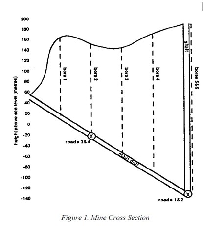 While the general geology has been proven and there is every confidence that the copper reserves are as claimed, the precise geology is not known. A more detailed geological knowledge is needed to provide information about the nature of the ground being tunnelled through and the exact location of the copper veins. More boreholes need to be sunk to provide cores of the geological strata from key locations, see Figure 1. Ten boreholes are required: four associated with the drift, two with the shaft and one with each vein. The mine cross section and plan indicate the approximate locations of the shaft, drift, roads and boreholes. There is no need to complete all the boreholes before mining begins, but each borehole must be finished before the immediately previous stage of the associated mining development can start. For example bore 1 must be finished before the main drift is started but the drift may then progress to the bottom of bore 1, even though bore 2 etc. may not be completed. However, tunnelling the drift can not continue to the intersection with roads 3 and 4 until bore 2 has been sunk. Similarly the sinking the shaft can not begin until bores 5 and 6 have been completed.