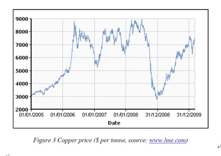 Various shift patterns have been considered but the mine will work a 5 day week for 50 weeks per year, with the weekends being reserved for maintenance and safety checks. The revenue has been estimated based on a conservative copper price of $5500 per tonne: the price of ore can be assumed to be proportionate to the price of copper. It is expected that the copper price will remain relatively high for the next few years, though price fluctuations are often unpredictable (see Figure 3).