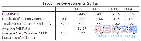 An area of success of the GEM is its ever-increasing numbers of listed companies, which have grown steadily from 54 in the first year to the current 199. But because of the much weaker price movements of the stocks, the GEM's total market capitalization has nudged higher from HKD67.3bn to HKD72.7bn for the same period, leaving the impression that the GEM could only manage to grow quantitatively instead of qualitatively, failing to transcend itself along the way. When compared to the main board's HKD5482.6bn market cap, the GEM's is only 1.33% of its size.#p#分頁標題#e#