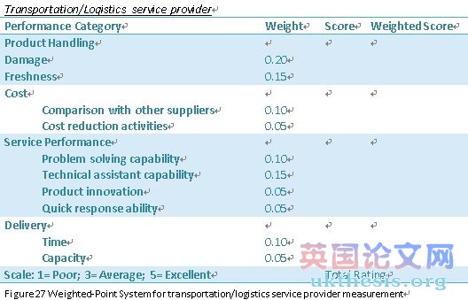 Service outsourcing may interact with many internal and external issues during the business. How to measure the outsourced service would directly influence the improvement of the business level. The relationship between outsourced service and internal functions is the key focusing point. For Floras, the prioritized outsourced service will be the transportation and logistics service. The movement of goods and customs clearance will be included in the service. The quality of the performance will greatly influence the quality of the rose, since rose is very sensitive in time and handling conditions. Therefore establishing a complete evaluation system for measuring the service provider performance would help to avoid any damage or delay of during the international delivery. #p#分頁標題#e#