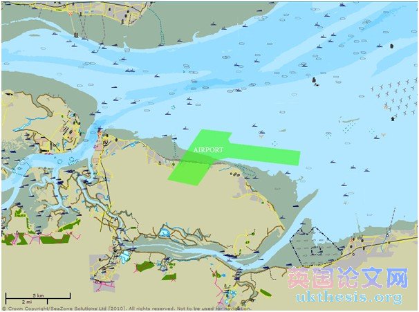 Figure 15 below shows the obstacles in the area around Isle of Sheppey. The area of construction should ideally avoid these as removal of many of them can prove to be economically and/or socially costly. As can be seen there are no obstacles present in the area of construction. However, in the case of future expansion of runways, there may be obstacles that will have to be removed before off-shore construction can commence; these include:
