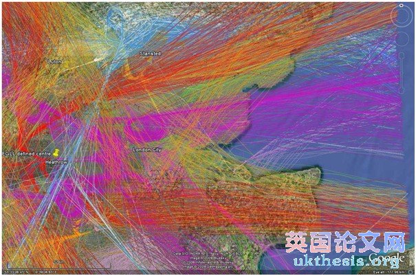 This feasibility study does not assess in detail the requirements for flight path planning. It is clear however that incorporation of flight paths for a new airport in the Thames Estuary is possible, without excessive modification or disruption to flight paths for the current major airports. The following figure shows current activity within a 24 hour period for London airports: http://ukthesis.org/ygsslwdx/