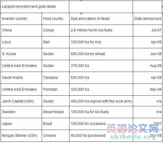 在2006 - 2008年,糧食價格的增加震驚了世界,用板條箱包裝的新趨勢成為應對全球糧食危機的重要方法。為了保證他們食物供應投資者的利益,在發展中國家國家收購土地的速度變得加快。根據聯合國糧農組織,自2004年以來,在五個撒哈拉以南國家,這樣的交易已經將250萬公頃的農田分配給外國投資者。然而,這些交易并不總是一個雙贏的局面,而是會引發新的殖民主義,并將當地居民的生計置于危險之中。這份報告顯示,全球土地本質上是一個政治問題,在發展中國家,土地改革和土地權利問題常常導致暴力沖突和社會政治不穩定。