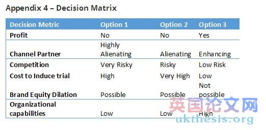 Based off the analysis, the best alternative to go forth with would be Option 3. This is mainly because it is the best channel that would avoid any horizontal conflicts stemmed because of a power struggle between the two separate channels. Option 3 also capitalizes on a growing trend in the market and the natural foods industry is expected to grow at 20% annually as well. It would be of interest to maintain and enhance the existing relationships with the channel partners since adding the supermarket channel into the system would make the partnership with the natural foods channel incompatible due to lack of incentives. Furthermore, this is the least risky option that they can invest in with higher returns on investment in comparison with the other options. With existing happy customers, a premium brand position, and strong partnerships with distributors like Wholefoods, Natureview can leverage its equity sources to increase revenue and market share by manufacturing the multipacks targeted towards the younger population. The decision matrix in Appendix 4 further supports this recommendation.#p#分頁標題#e#